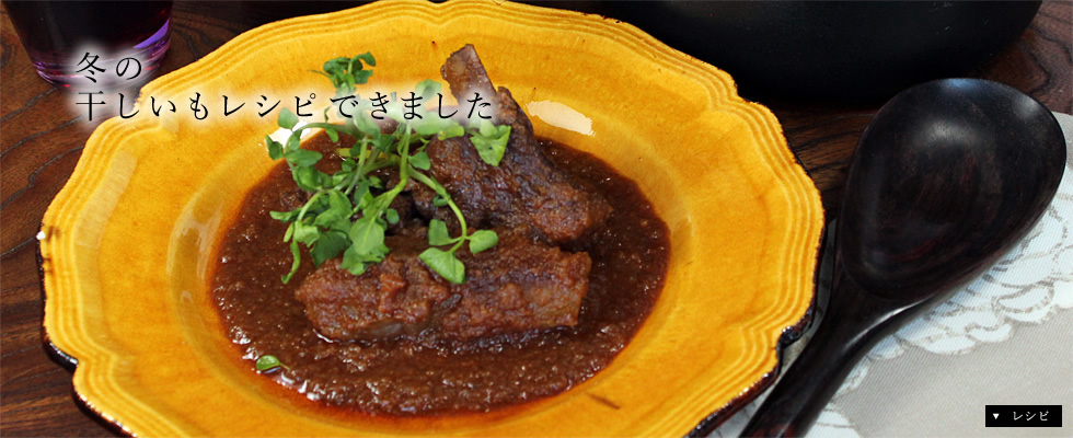 ソーセージとひよこ豆、丸干しいもをスープで煮込みました。丸干しいもの優しい甘さがスープに溶け込み、スープを吸った丸干しいもがまた更に美味しくなる。そんな味の相乗効果も楽しめます。寒い冬、毎日でも食べたい身も心も温まるメニューです。