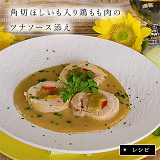 夏のおもてなし料理としても重宝な一品。鶏肉からのコラーゲンのとろみが、いずみ角切り芋とパプリカを包み込み、ツナとアンチョビとケッパーとオリーブオイルのソースがこの料理を引き立てています。シチリアでは夏にツナをよく食べるそうです。キリっと冷やしたスパークリングワインとともにどうぞ。